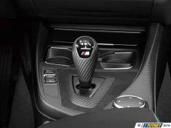 Finish off the M2 carbon interior trim with this factory BMW trim kit. The kit includes a carbon fiber DCT shift knob, carbon DCT shifter base, and carbon and alcantara parking brake handle. The black plastic trim surrounding the shifter base is replaced by soft alcantara and the bright silver shifter surround is replaced with carbon fiber matching the rest of the center console. This is a factory BMW accessory package so all of the pieces are guaranteed to fit perfectly and match the finish of the stock M2 trim.